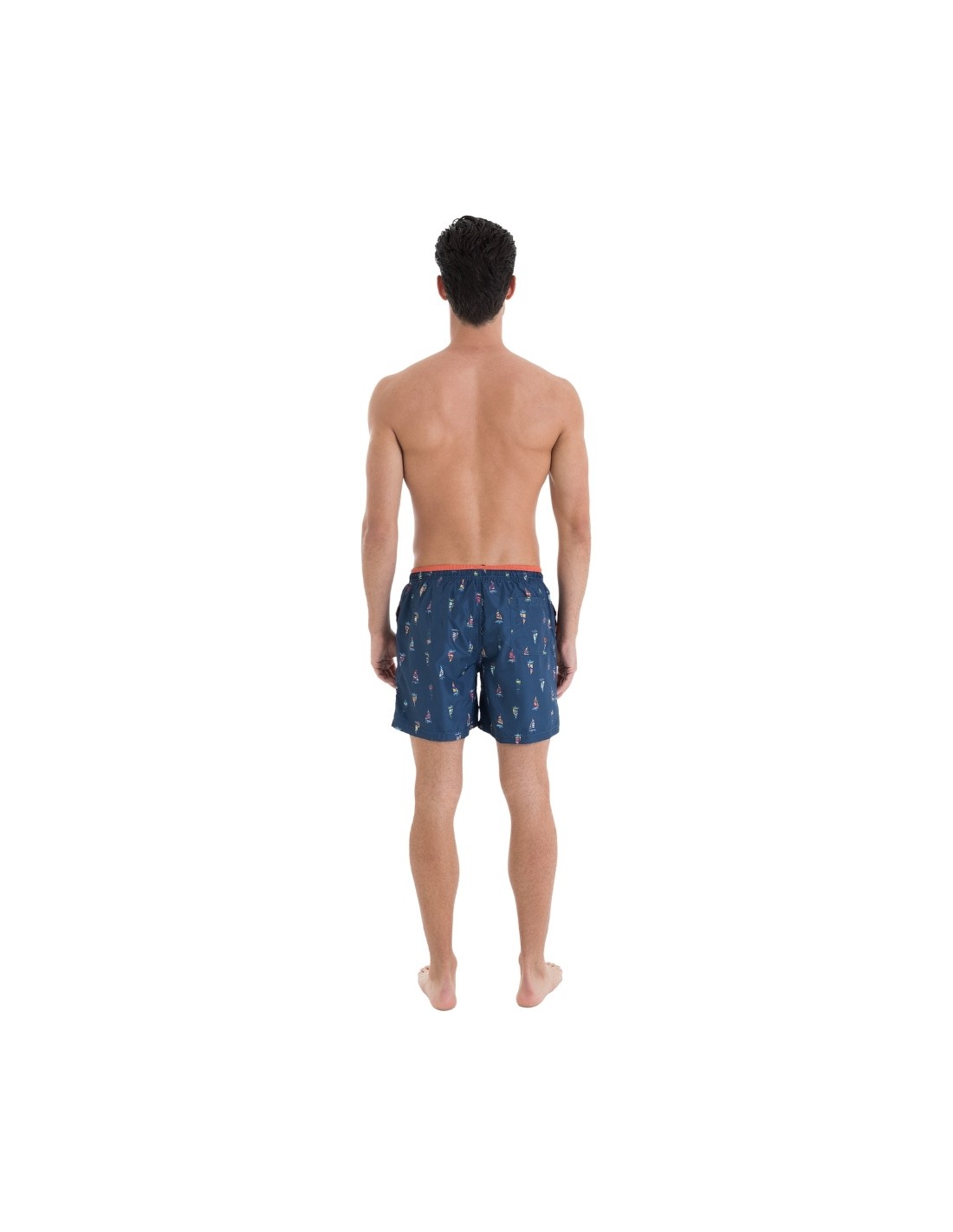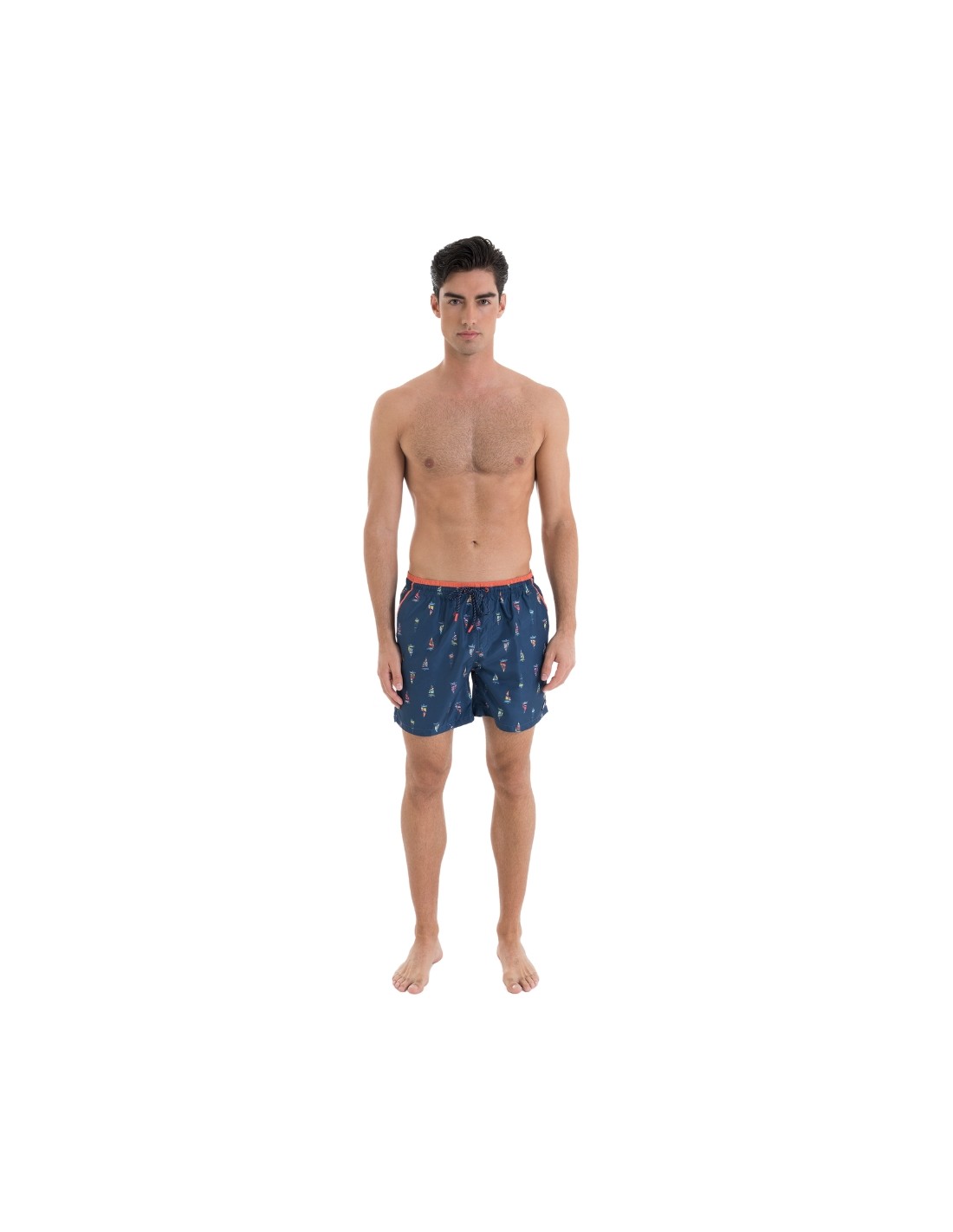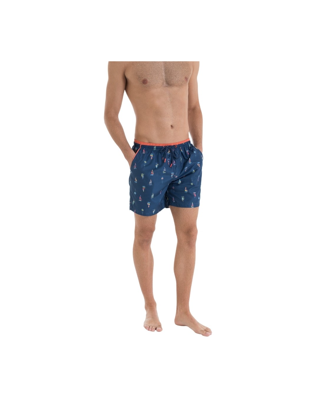 Este bañador de hombre en color marino con estampado náutico es ideal para el verano. Su diseño cuenta con cintura elástica ajustable con cordón y bolsillos laterales para mayor comodidad. Fabricado en tejido ligero y de secado rápido, perfecto para la playa o la piscina.