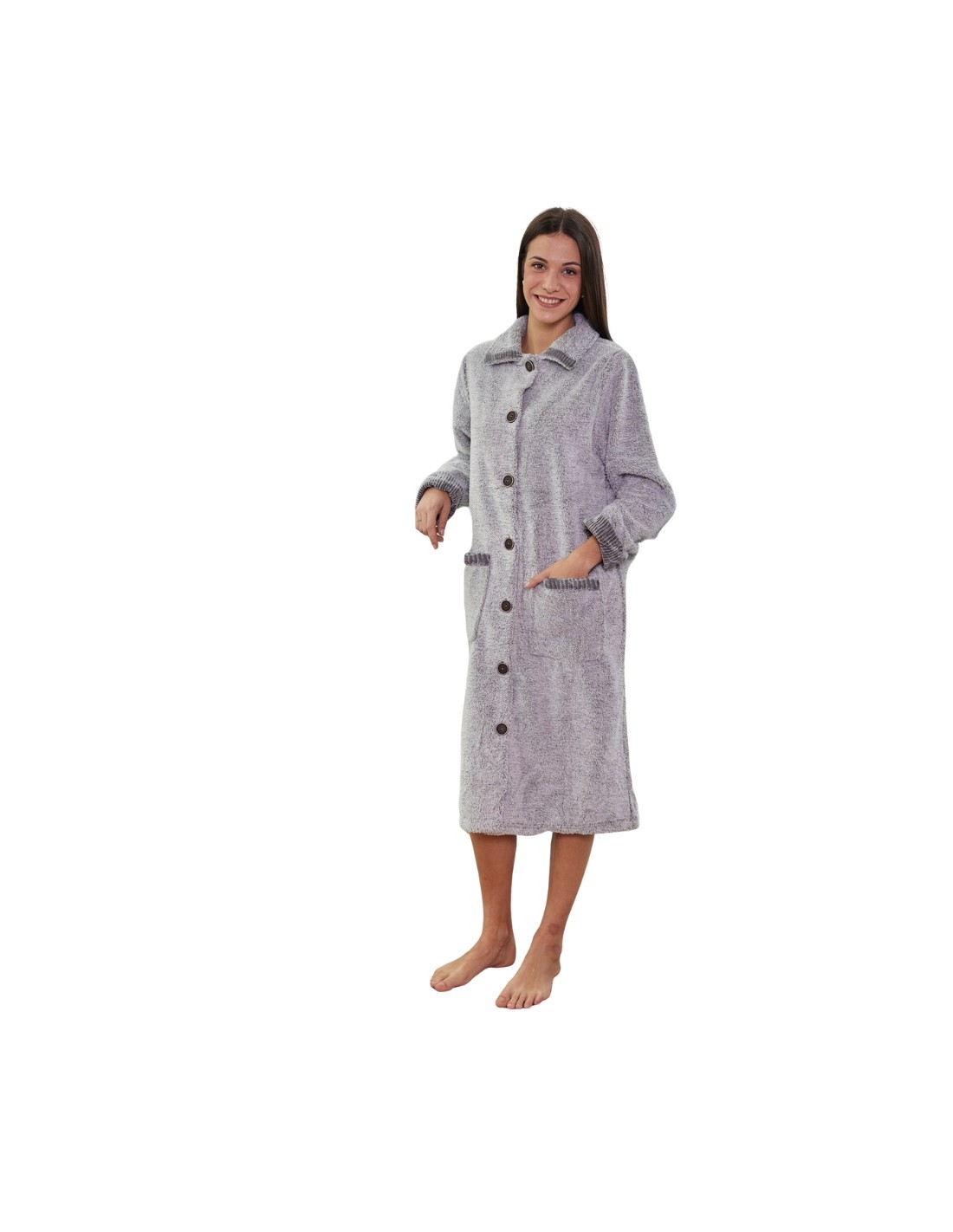 Bata larga de mujer para invierno con diseño abotonado muy práctico y tejido extra suave. Ideal para mantenerte abrigada durante los días fríos, combina funcionalidad y estilo gracias a sus grandes bolsillos delanteros y su acabado jaspeado en tono gris. El cuello camisero y los puños con detalle de canalé aportan un plus de confort y elegancia para estar cómoda en casa. Perfecta para usar sobre pijamas o ropa de estar por casa durante los meses de invierno.