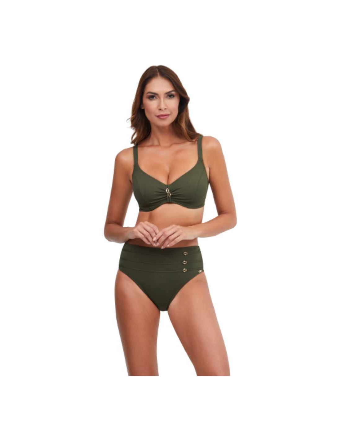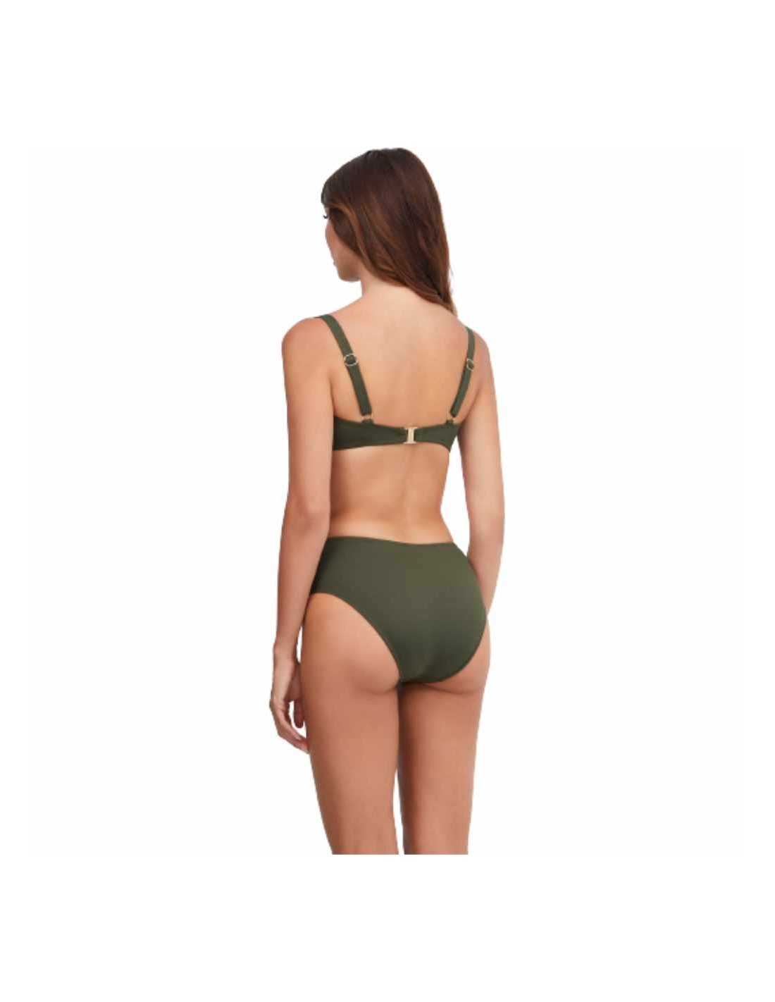 Bikini formado por sosten con aro y sin relleno en copa D, que recoge y centra el pecho consiguiendo en bonito escote. Además sus tirantes regulables consiguen un ajuste perfecto. Va acompañado de una braguita de tamaño midi toda forrada y con detalle de lorzas con aplique. Un básico que nunca pasa de moda.