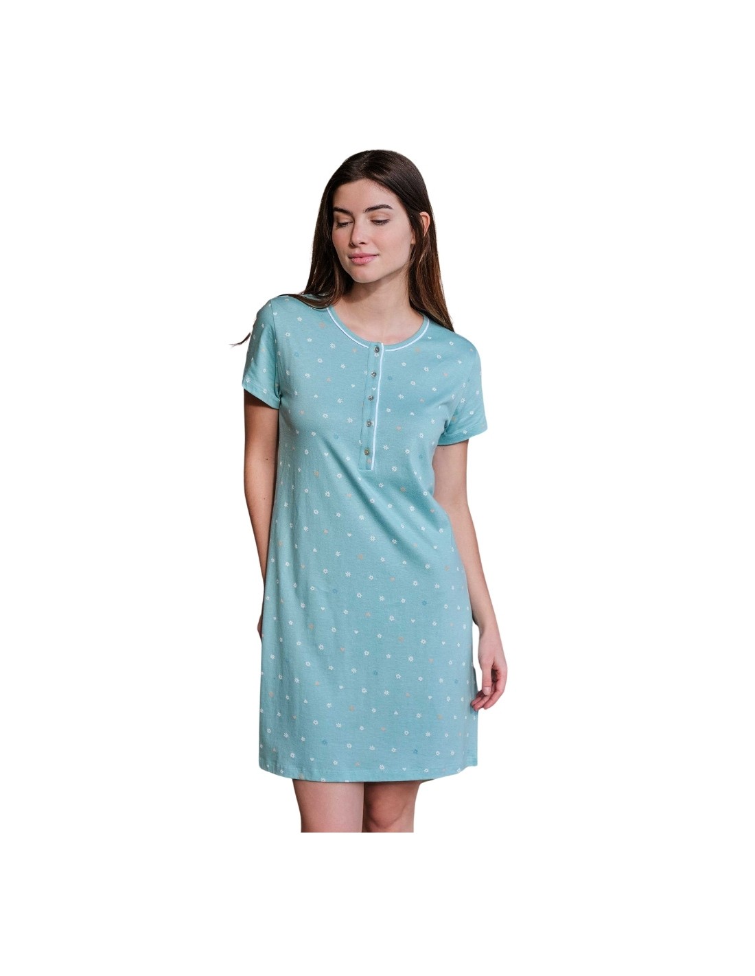 Camisón de mujer de invierno con manga corta, ideal para quienes buscan comodidad sin renunciar al estilo. Presenta un diseño con pequeños estampados florales y tapeta abotonada en el pecho, en un delicado tono azul que transmite frescura y suavidad. Confeccionada en tejido de tacto agradable, perfecta para dormir o relajarse en casa.