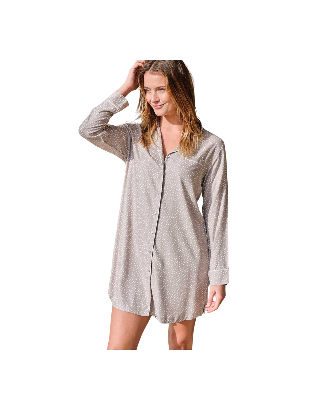 Camisola de mujer abierta de invierno en color visón, con un elegante diseño de botones frontales y estampado de pequeños lunares. Su corte camisero y el tejido fluido la hacen ideal para descansar con estilo y comodidad. Perfecta tanto para dormir como para estar en casa con un toque sofisticado.