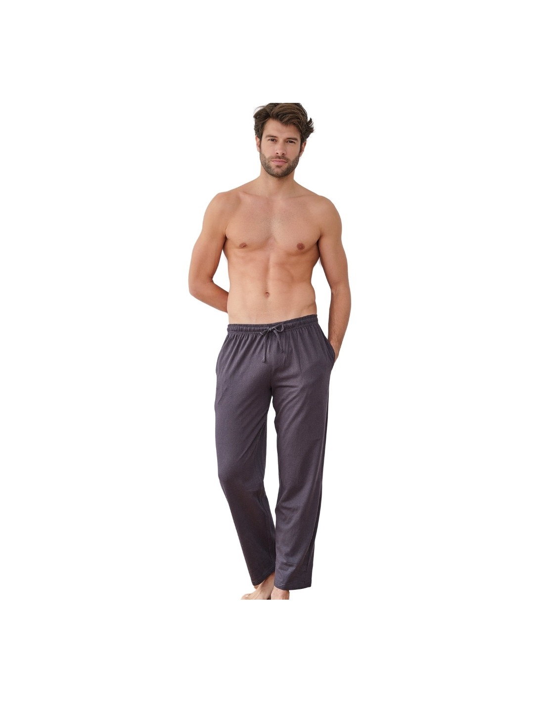 Pantalón de hombre de invierno en color gris con detalles en marino, perfecto para el descanso o para combinar con camisetas. Incorpora goma pasada en la cintura y cordón ajustable, además de bolsillos laterales funcionales. Ligero y cómodo para los días calurosos.
