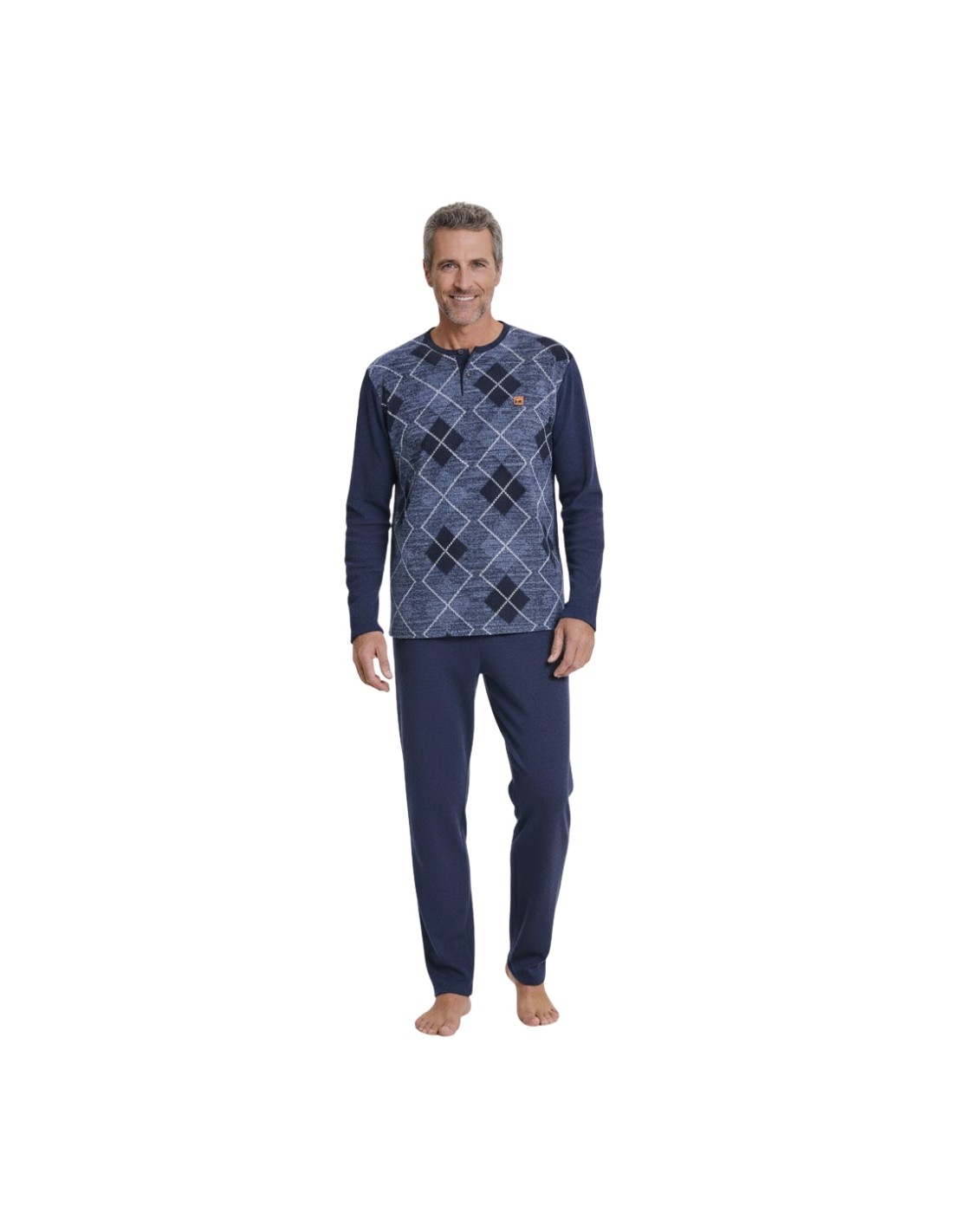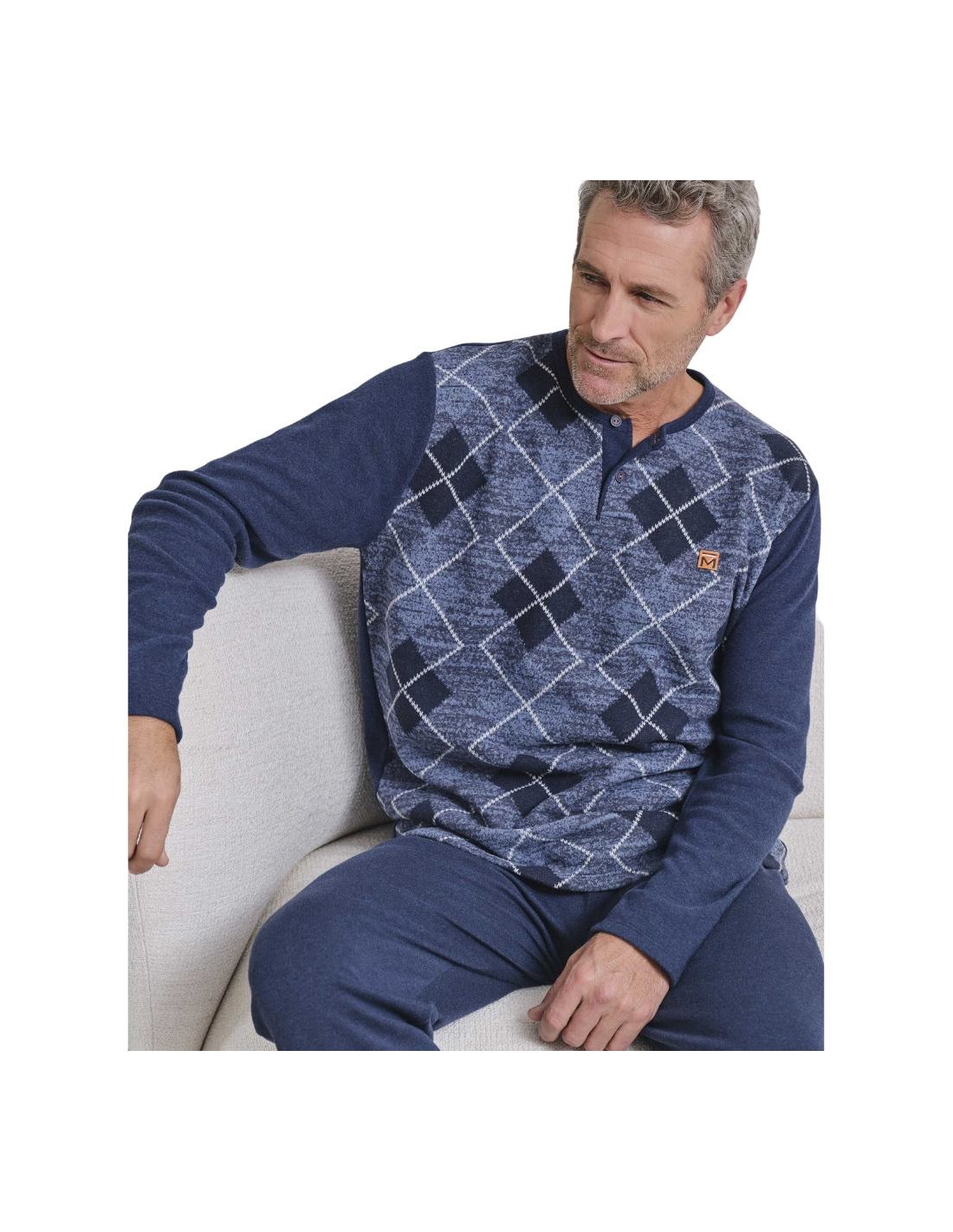 Pijama de hombre para invierno con camiseta de manga larga en color marino y diseño de rombos en el pecho, combinando tonos azules y grisáceos. Lleva cuello redondo con tapeta y botones, ideal para un look clásico y cómodo.El pantalón largo a juego completa este conjunto cálido y funcional, perfecto para el descanso diario durante los meses fríos.