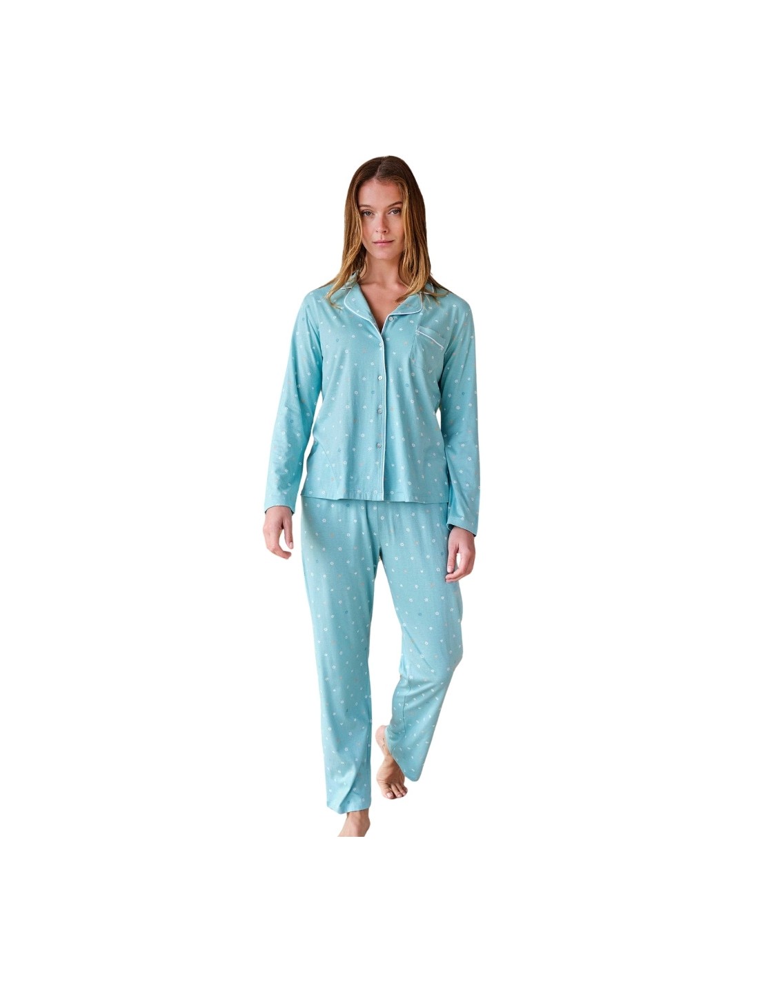 Pijama de mujer en color turquesa con diseño camisero clásico y delicado estampado. Ideal para el invierno por su tacto suave y tejido confortable. Ofrece estilo y calidez para descansar con elegancia en casa.