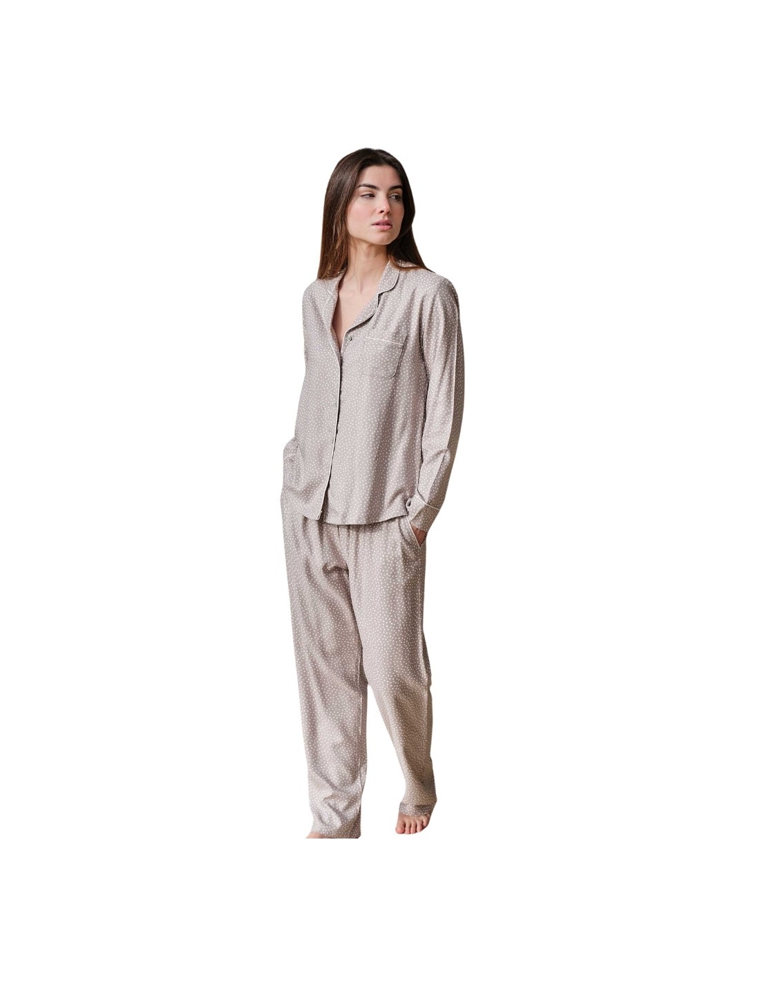 Elegante pijama camisero de mujer en color visón con estampado sutil y tejido fluido. Ideal para el invierno, combina estilo relajado y máxima suavidad para tus momentos de descanso en casa.