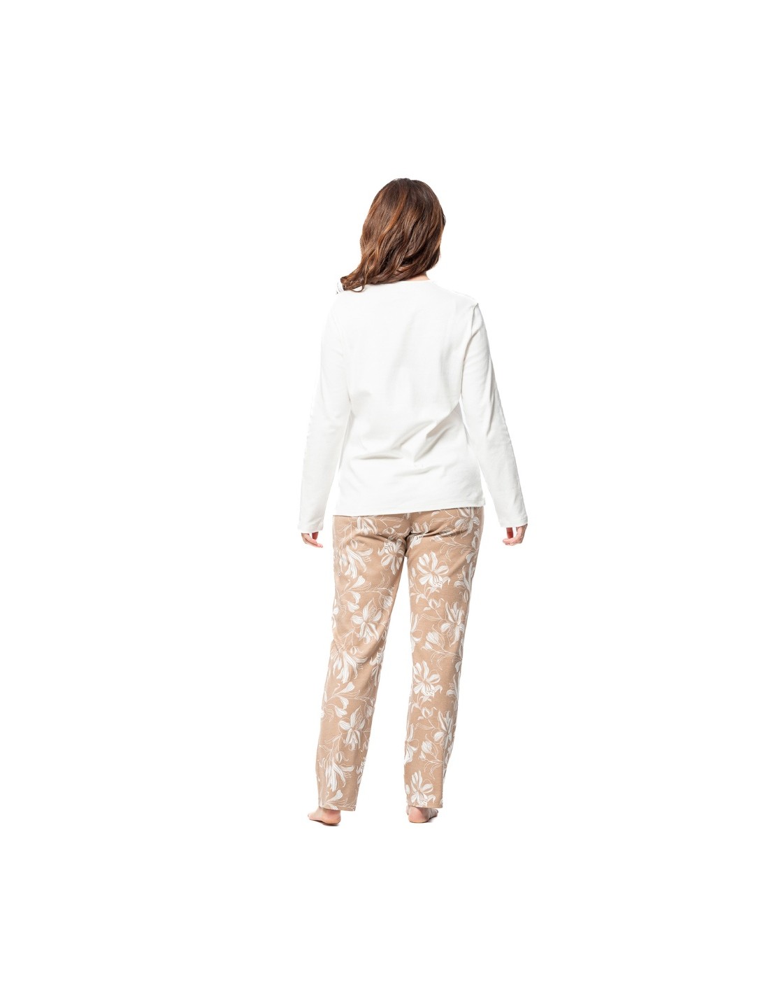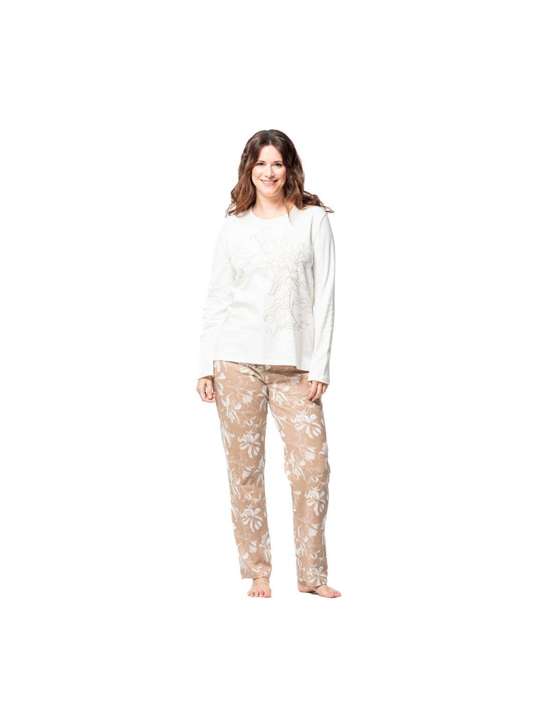 Pijama de mujer con camiseta de manga larga y cuello redondo, decorada con un elegante estampado floral a tono. El pantalón largo combina perfectamente con la parte superior gracias a su diseño con flores en tonos beige. Ideal para las noches de invierno por su tejido cálido y suave. Puedes completarlo con la bata modelo 252508 para un conjunto perfecto.