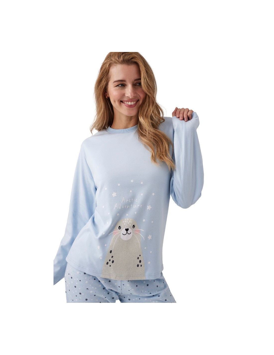 Pijama de mujer confeccionado en algodón con un simpático estampado de focas, ideal para los meses de invierno. El conjunto de dos piezas incluye camiseta de manga larga y pantalón largo con puños en el bajo, que aportan un ajuste cómodo y moderno. El tejido de algodón proporciona suavidad, transpirabilidad y calidez para un descanso confortable. El color azul suave y el diseño divertido lo convierten en una opción acogedora y con estilo para el hogar. Perfecto para relajarte o dormir cómoda y abrigada durante el invierno.