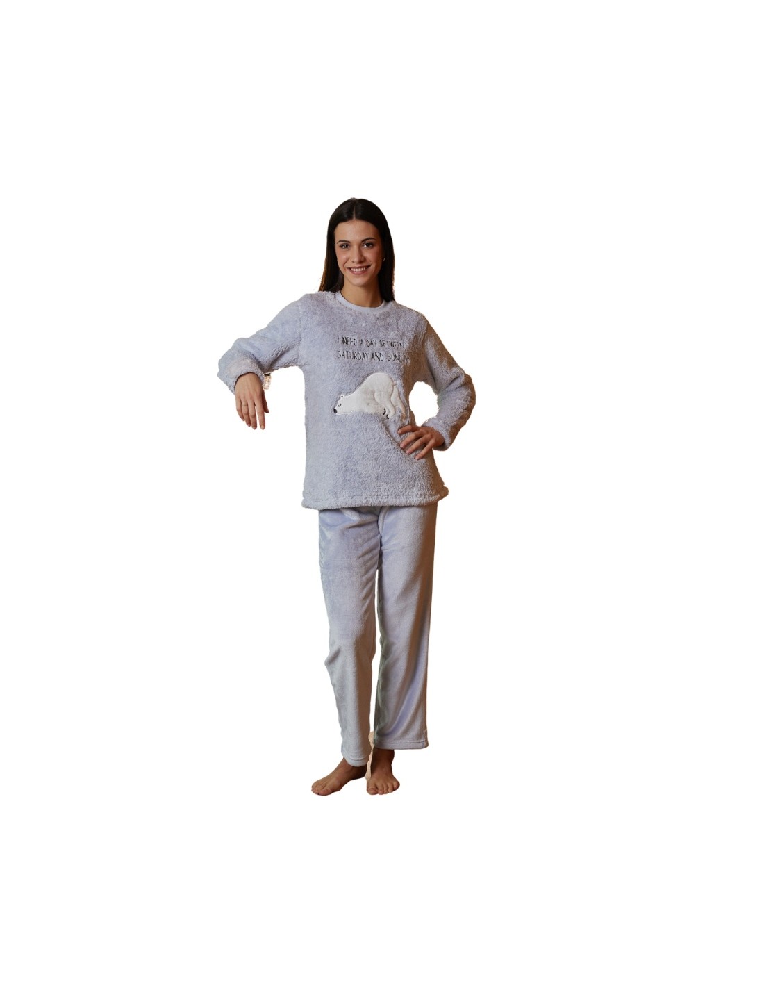 Pijama de invierno para mujer confeccionado en tejido polar extrasuave. La parte superior tiene un diseño tierno con oso polar y mensaje bordado, ideal para relajarte con estilo.El color lavanda claro y la textura afelpada ofrecen máxima calidez y comodidad durante los días fríos. El pantalón largo a juego completa un conjunto acogedor y dulce.