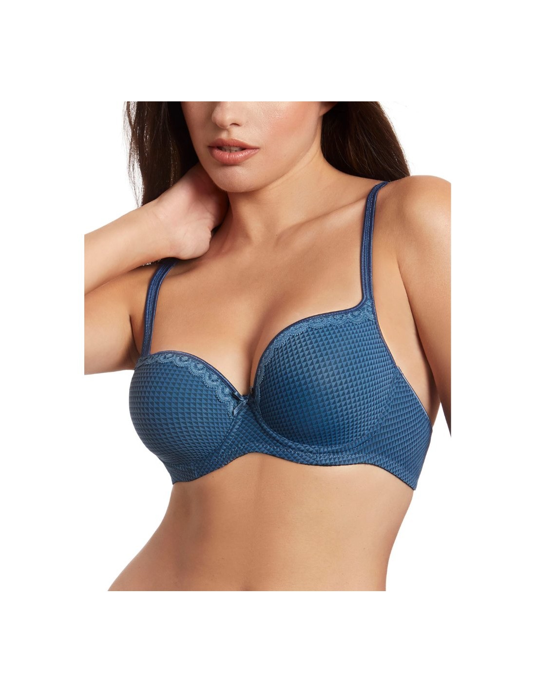 Sujetador copa B con aros y con relleno. La copa combina un tejido que simula una original cuadrícula y un vivo de encaje en el mismo tono que ofrecen a la prenda un aire joven y exclusivo. Las espaldillas son del mismo tejido a cuadros y la parte trasera tiene una pequeña aplicación de la misma blonda a modo decorativo. Hace juego con el tanga 3123 y el bikini 3124.