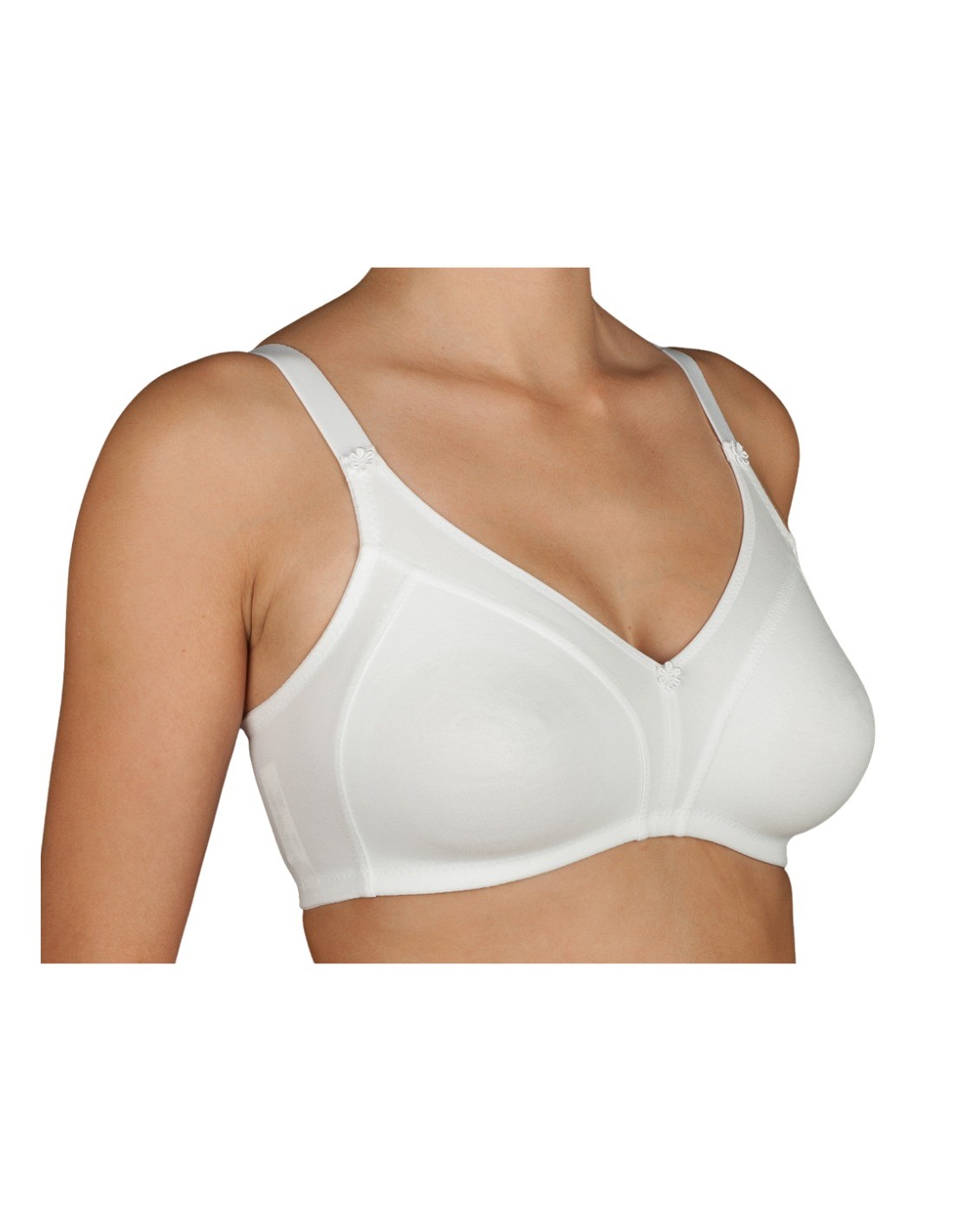Sujetador copa D sin aros y sin relleno, de algodón y refuerzos inferiores y laterales. Apropiado para alergias y post operatorios quirúrgicos.