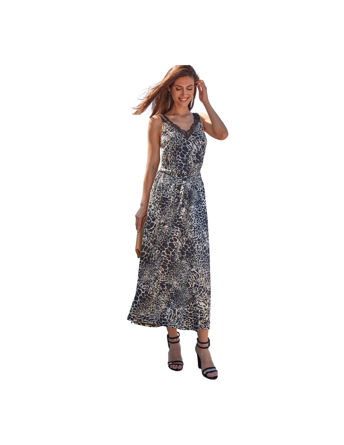 Vestido largo sin mangas con escote en pico y detalle de encaje, realzado con un favorecedor estampado animal print. Ideal para un look veraniego elegante y fresco, perfecto tanto para el día como la noche.
